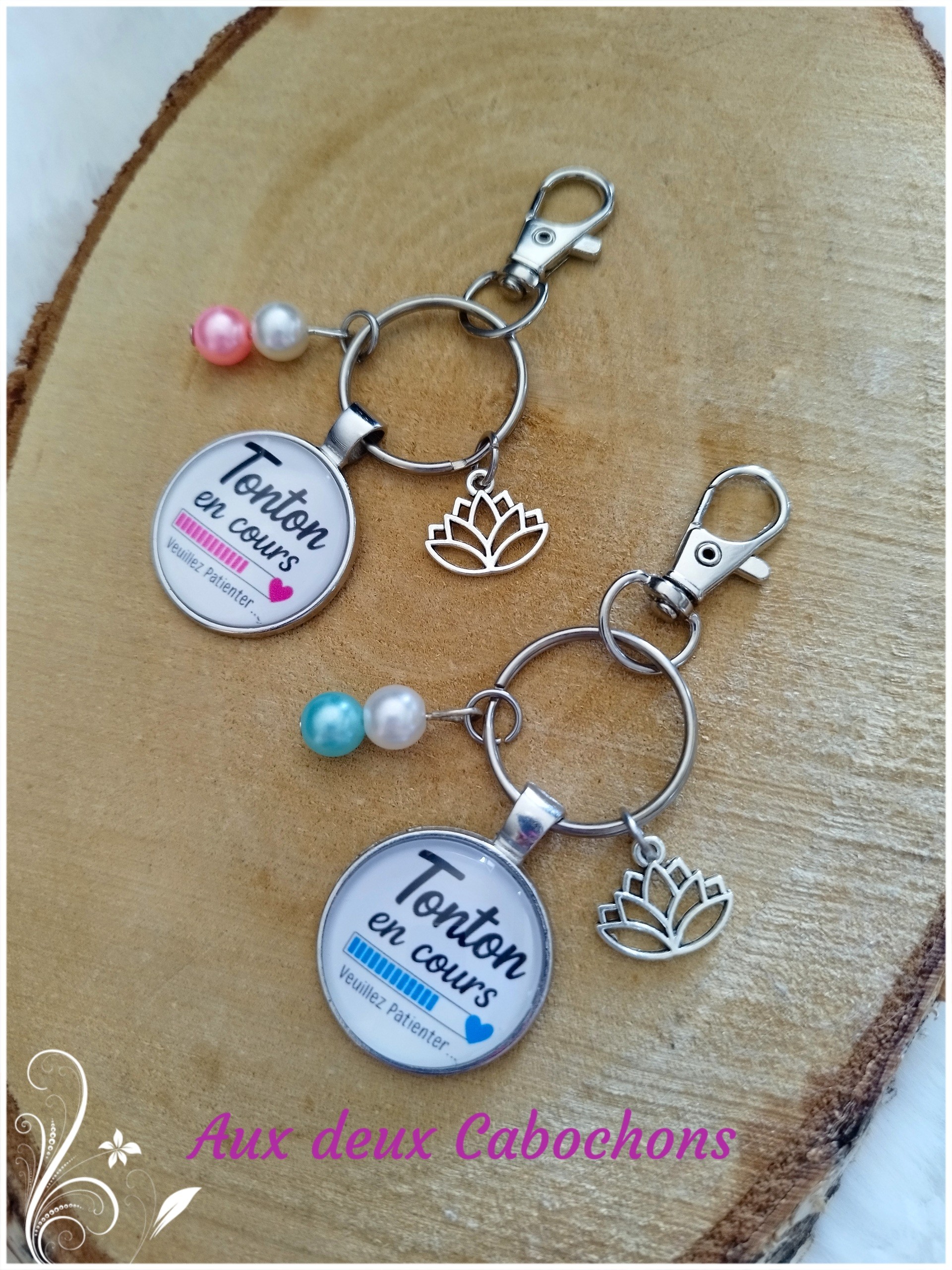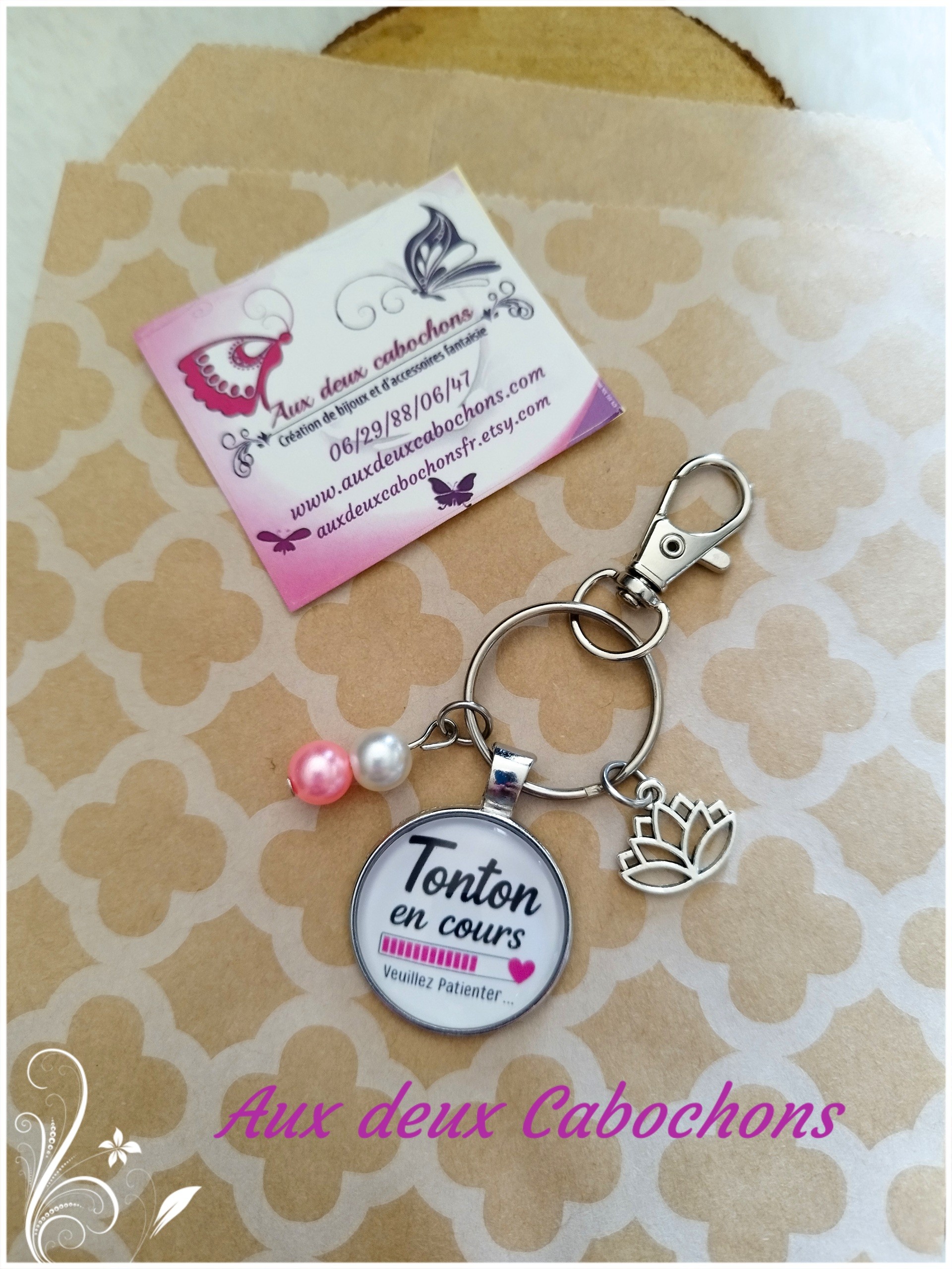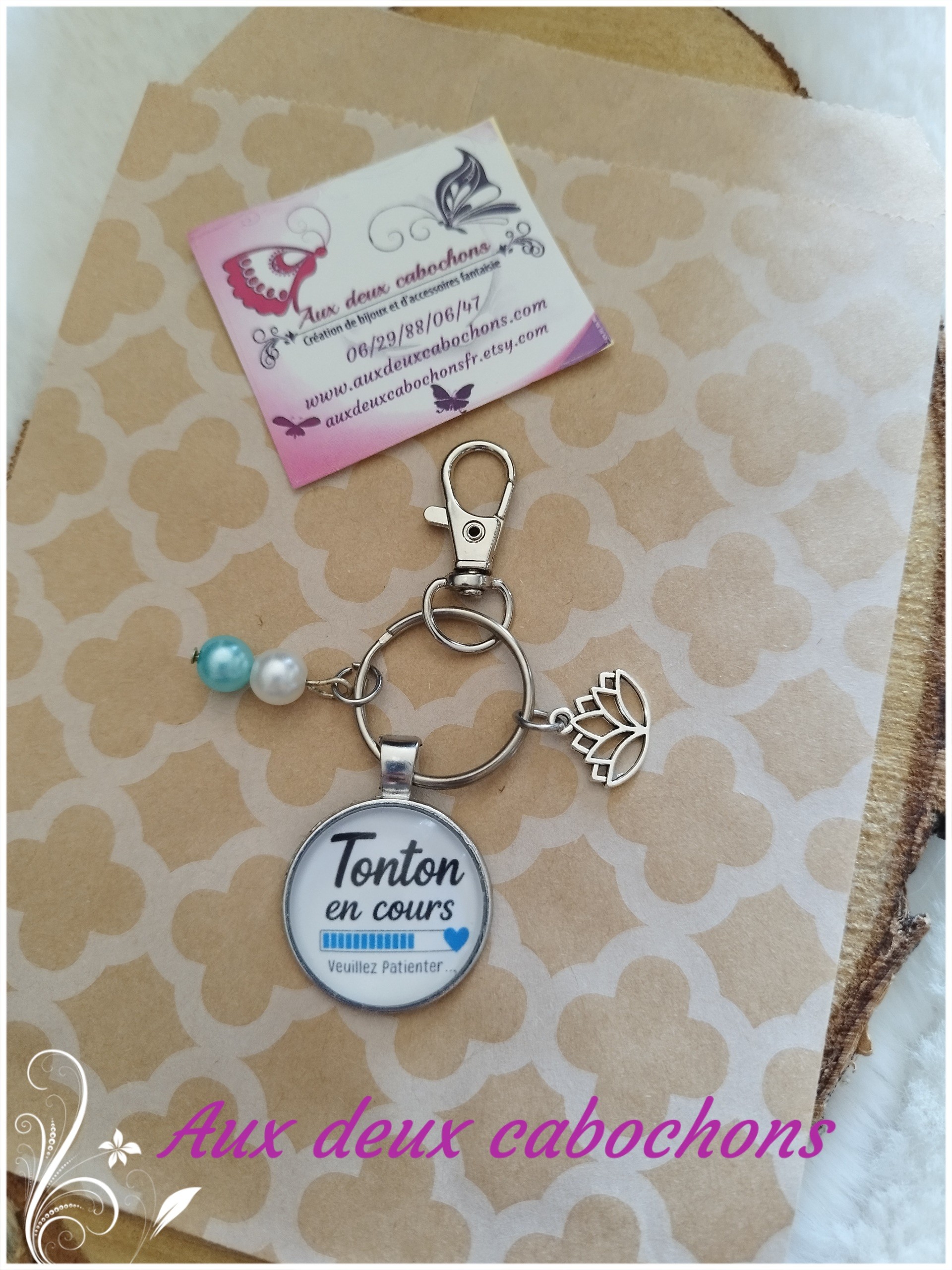 D’un médaillon rond sous cabochon en verre, inscription “tonton en cours – Veuillez patienter”