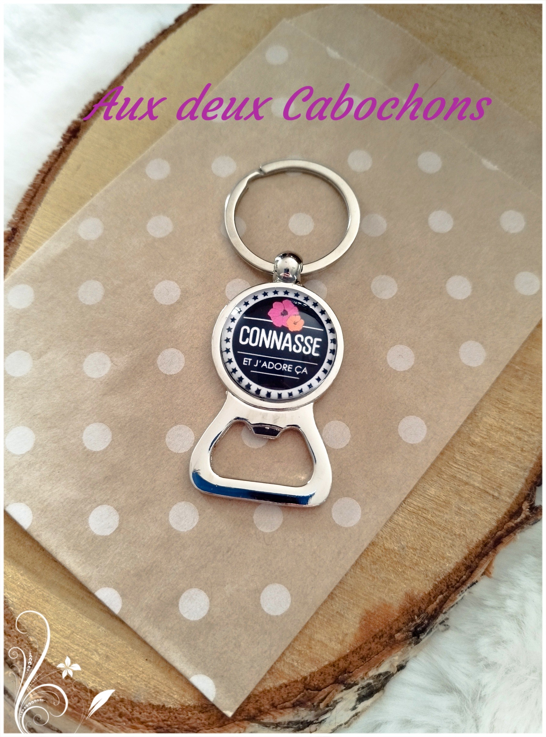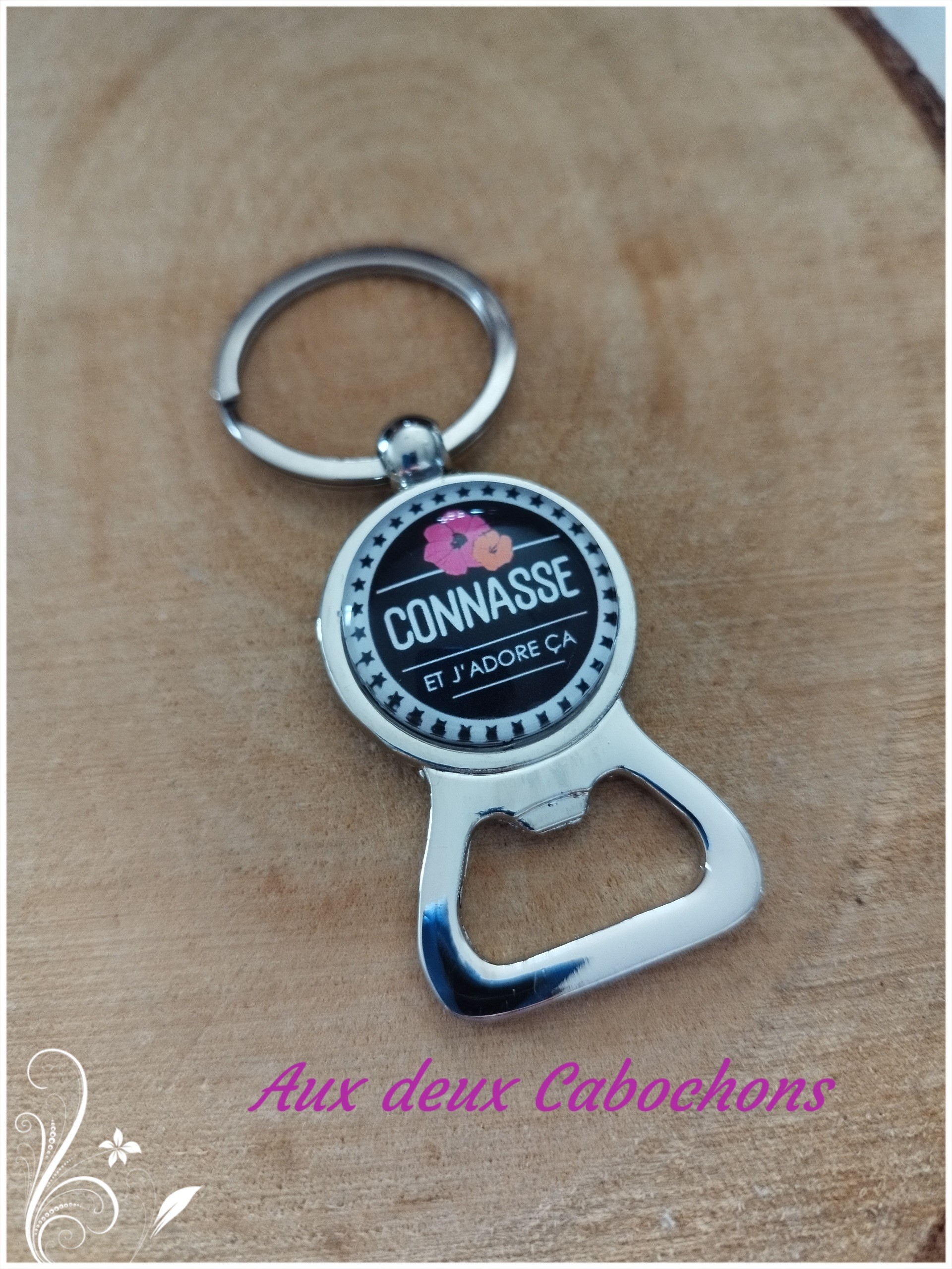 Ce porte-clés décapsuleur en métal argenté sans oxyde est orné d’un cabochon en verre de 25 mm avec l’inscription “Connasse et j’adore ça”.