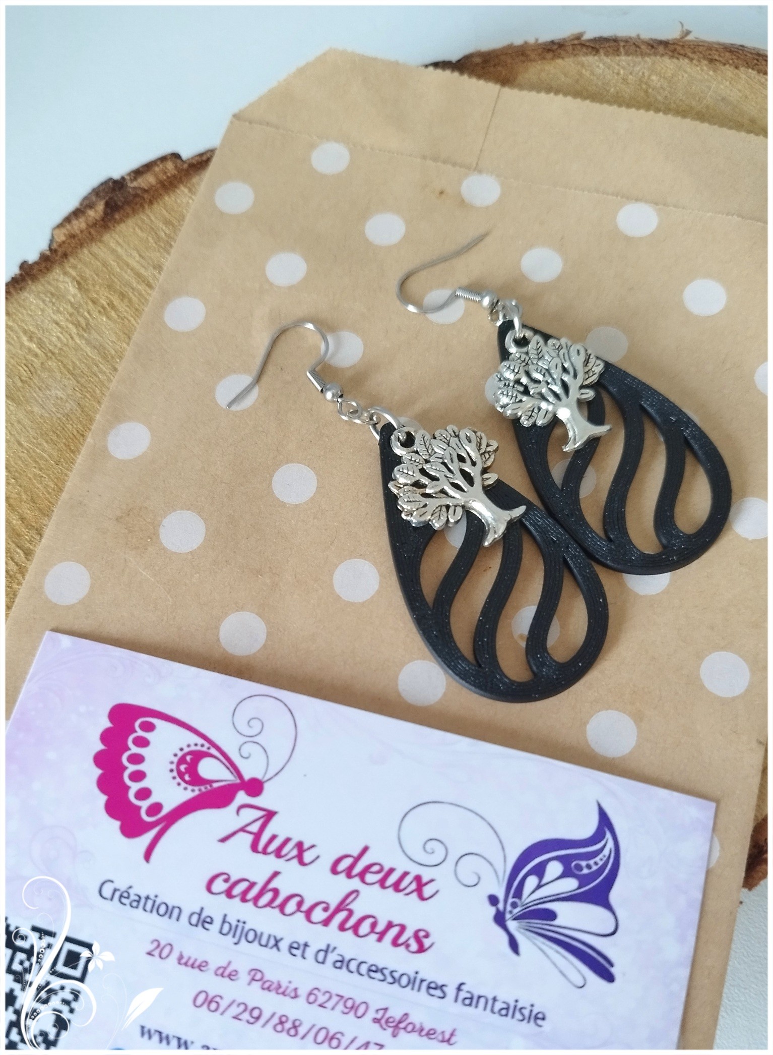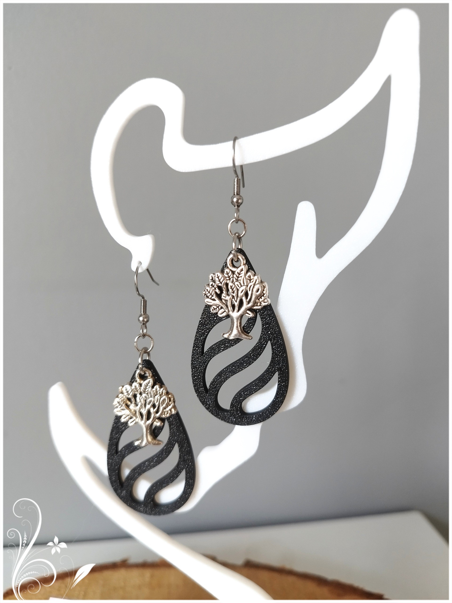 Elles associent un motif Arbre de vie argenté à une goutte ajourée en plastique 3D noir, pour un rendu moderne, léger et graphique.