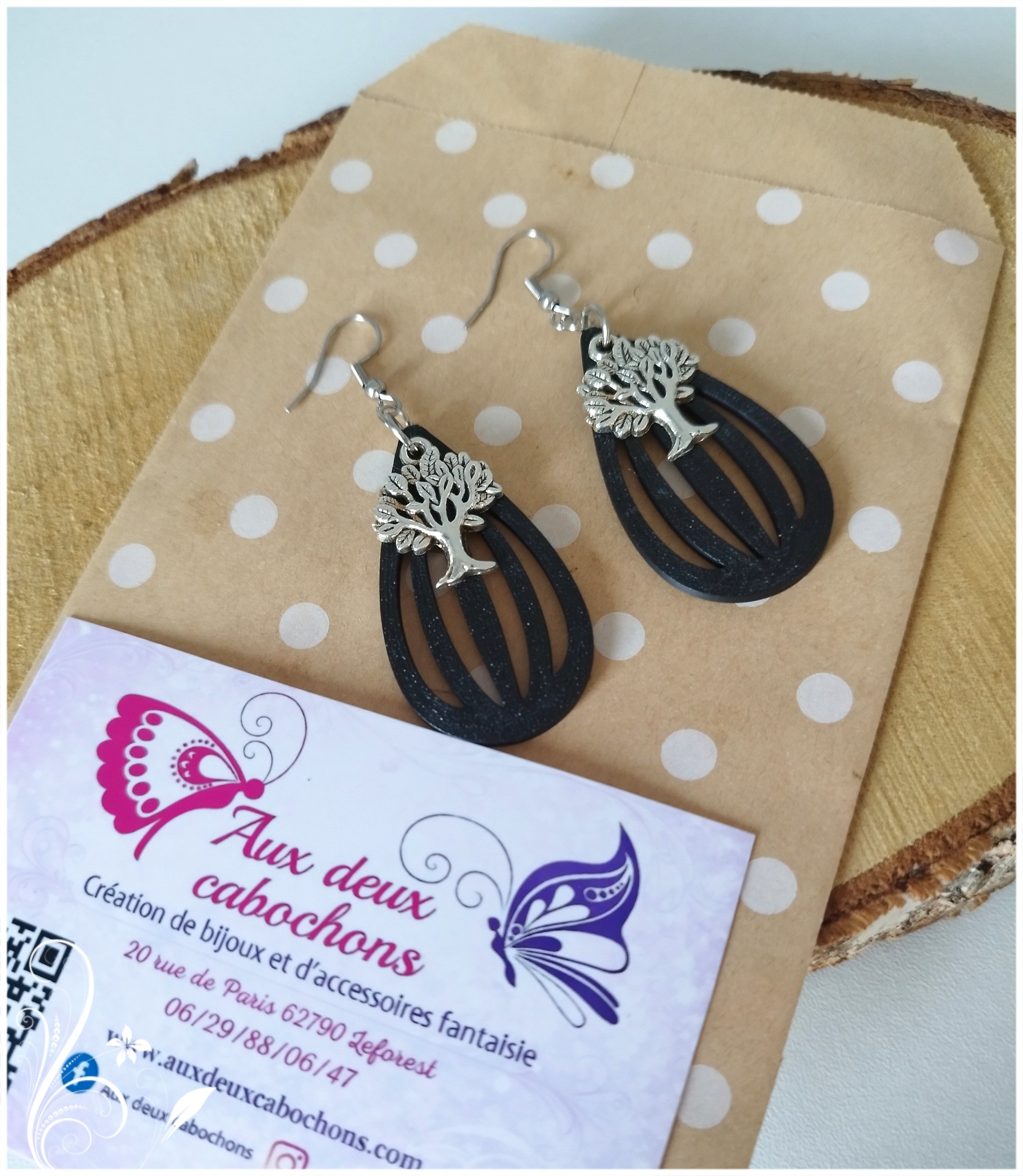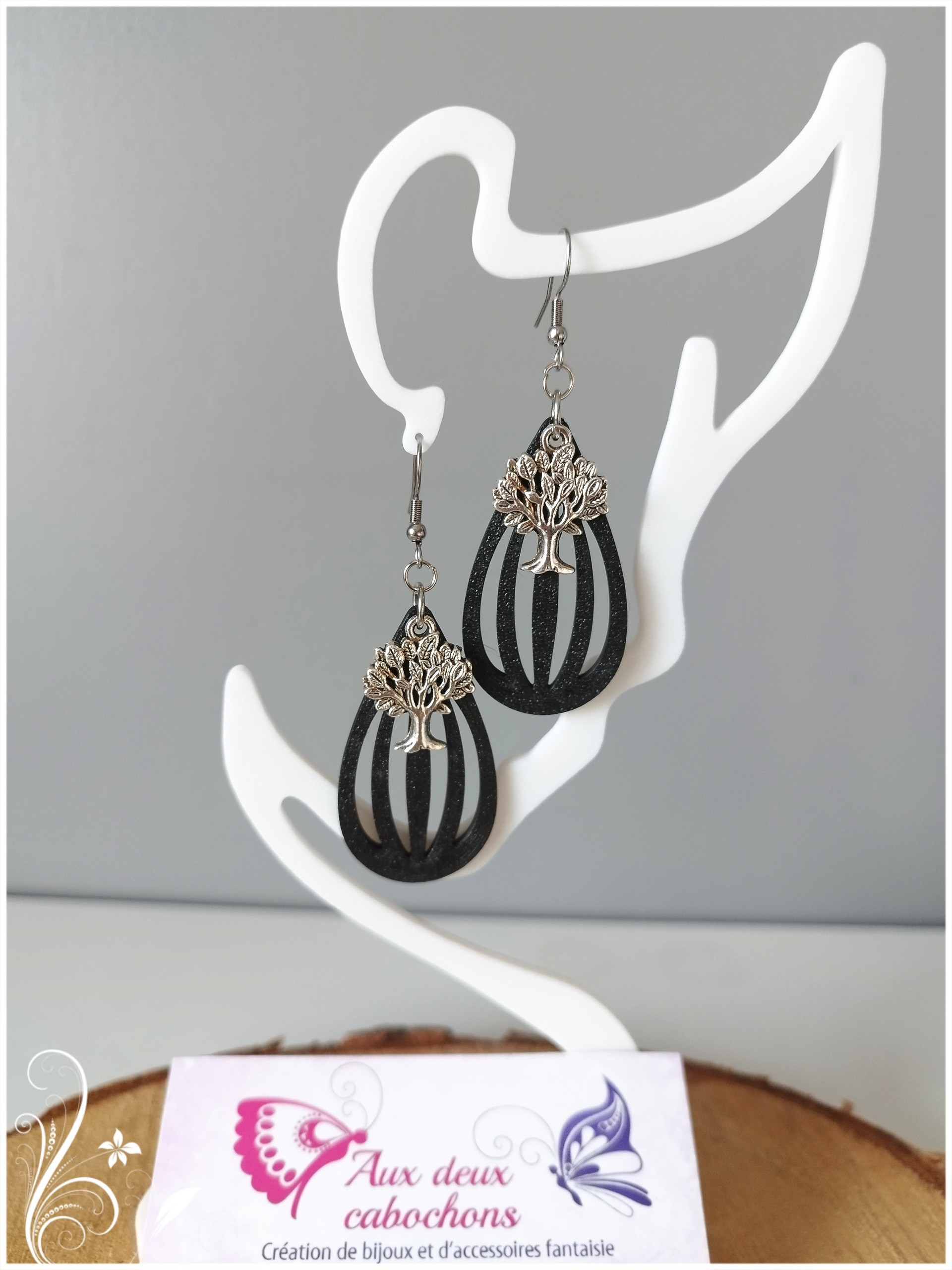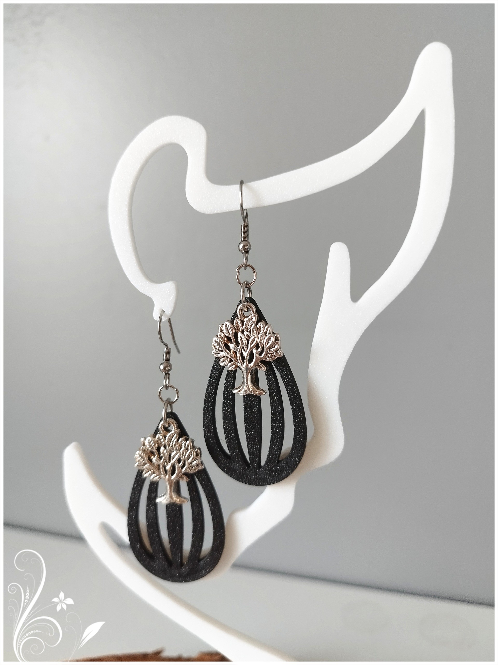 Elles associent un motif Arbre de vie argenté à une goutte ajourée en plastique 3D noir, pour un rendu moderne, léger et graphique.
